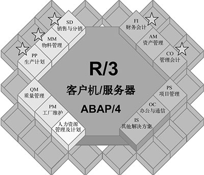 除了強勢的系統(tǒng)體系結構,SAP更集中了強大的業(yè)務處理模塊,代表了SAP在ERP領域的先進思想。以R/3為例介紹如圖1-3所示的各基本業(yè)務模塊。